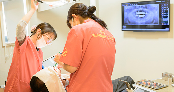 歯科医師や歯科衛生士とともに、定期的に全体勉強会なども行い、症例検討における診査診断、治療工程、患者指導、予後の判定などのディスカッションも、実力をつけるのに役立っています。